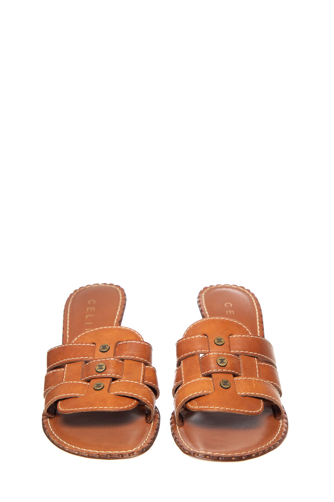 Celine Cognac Leather Triomphe Kitten Heels. This item is in good condition; heel cap on right shoe has split. AS IS.