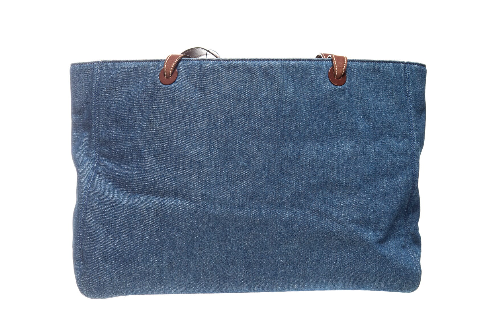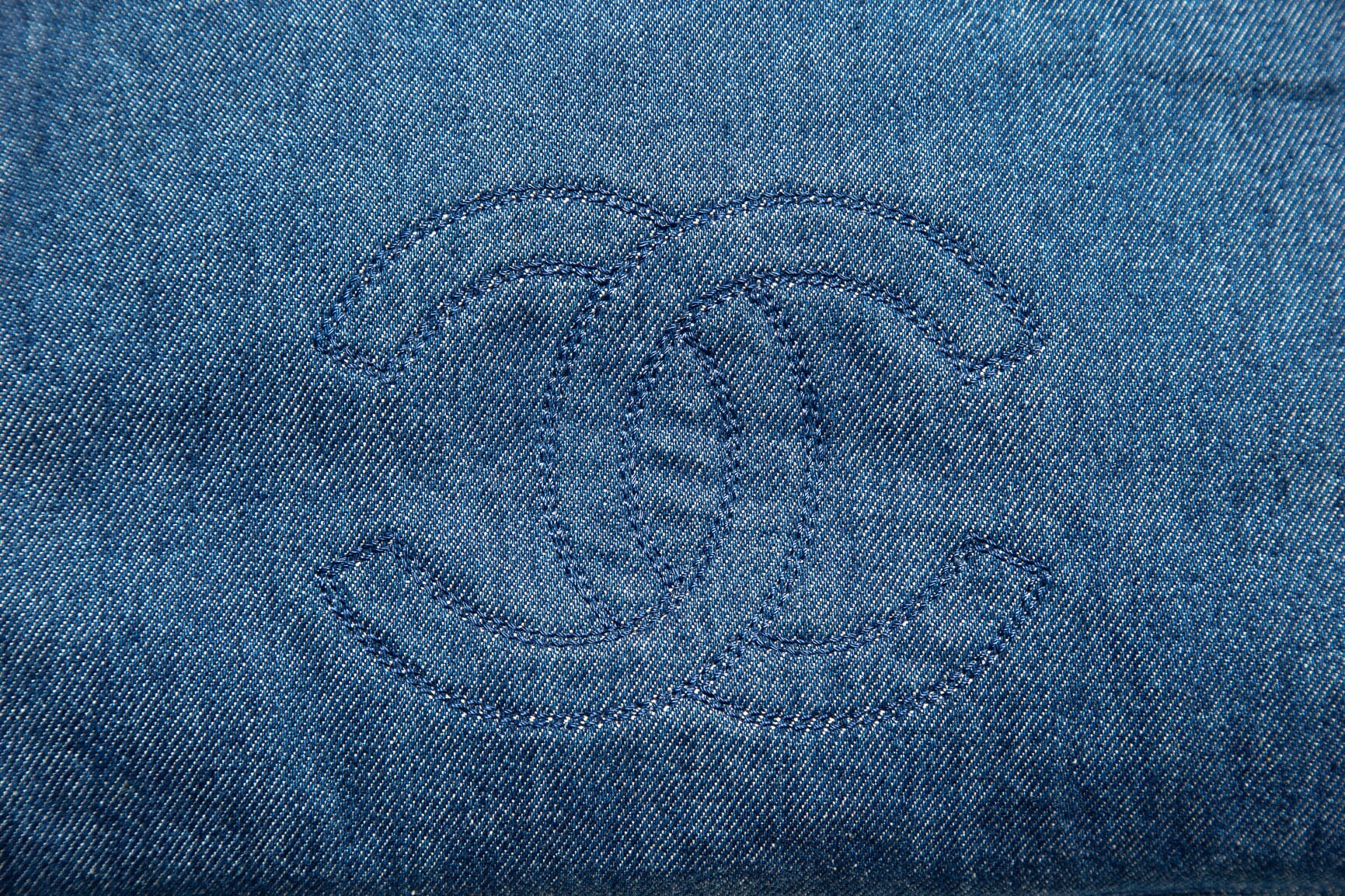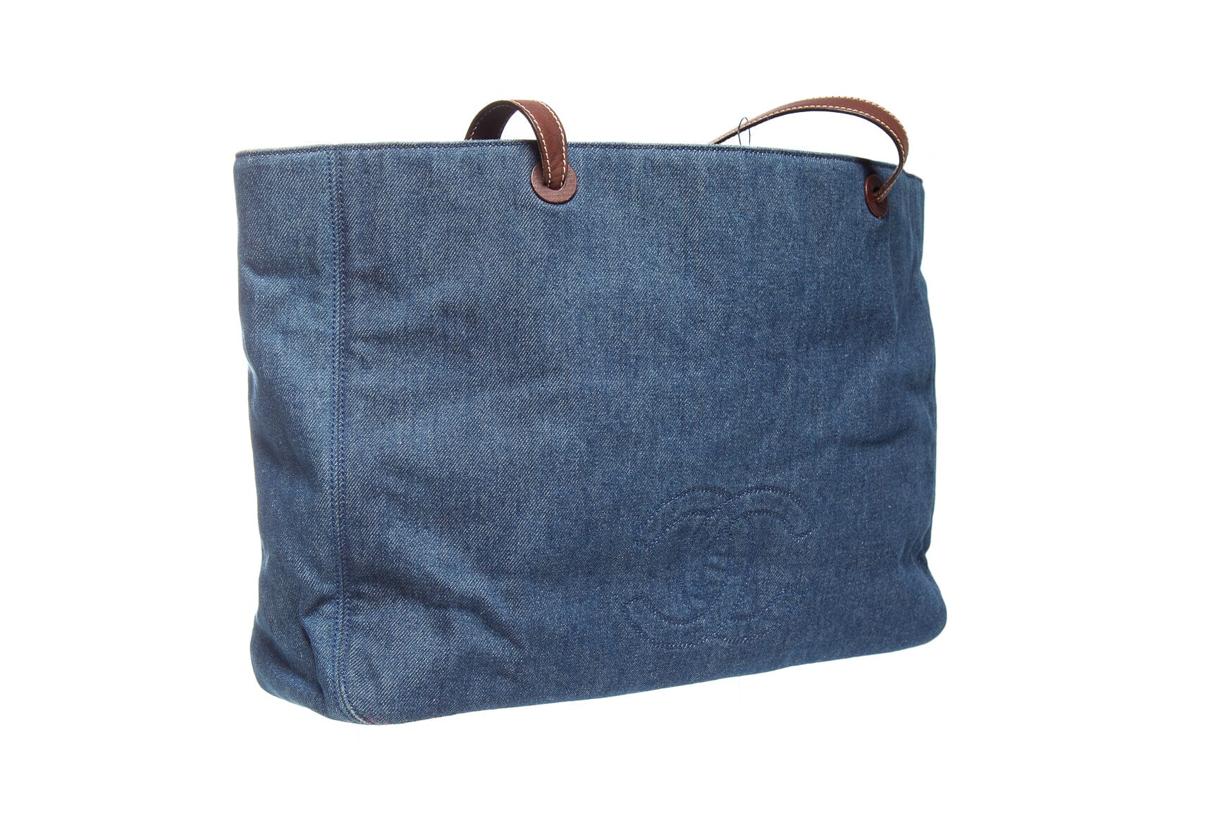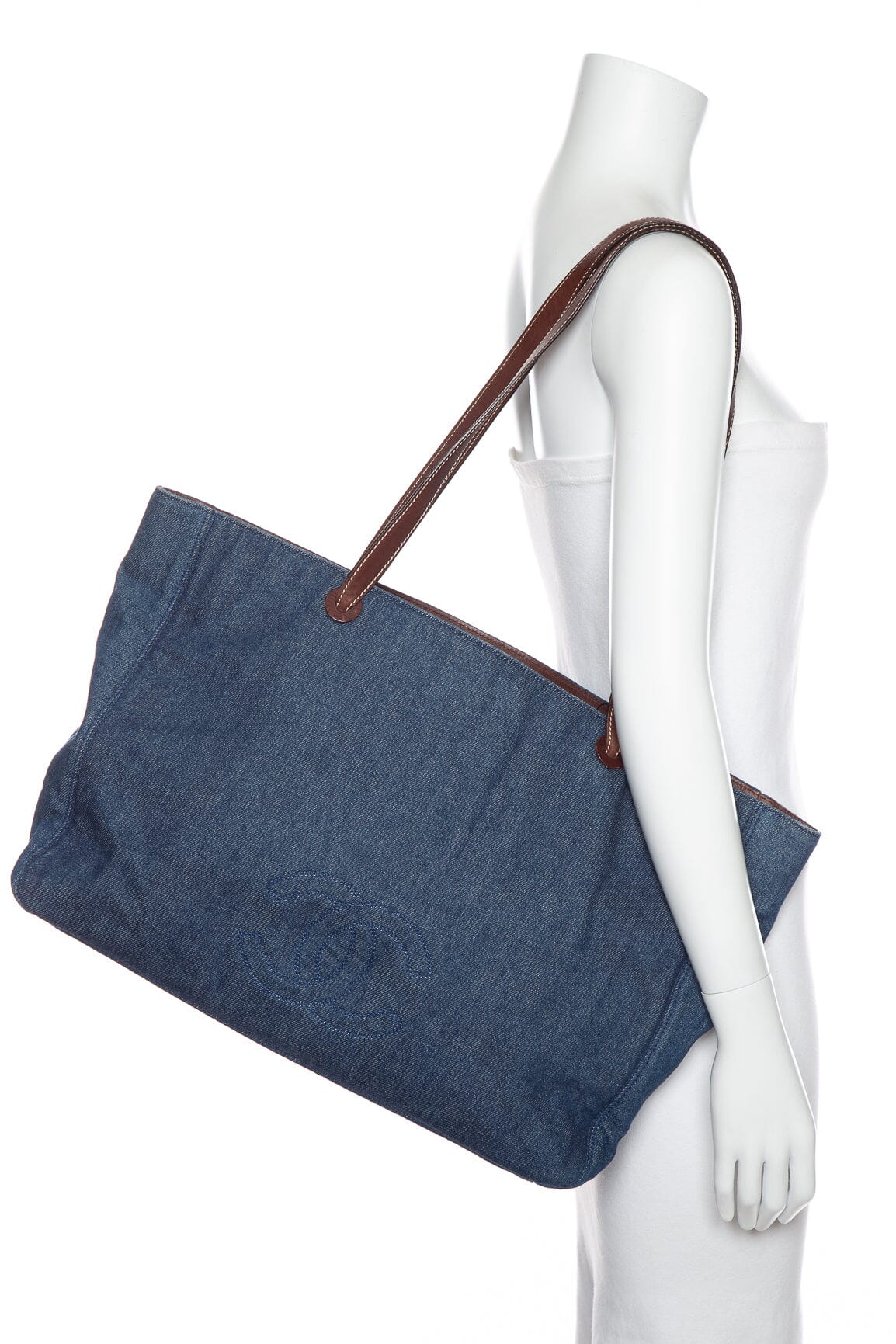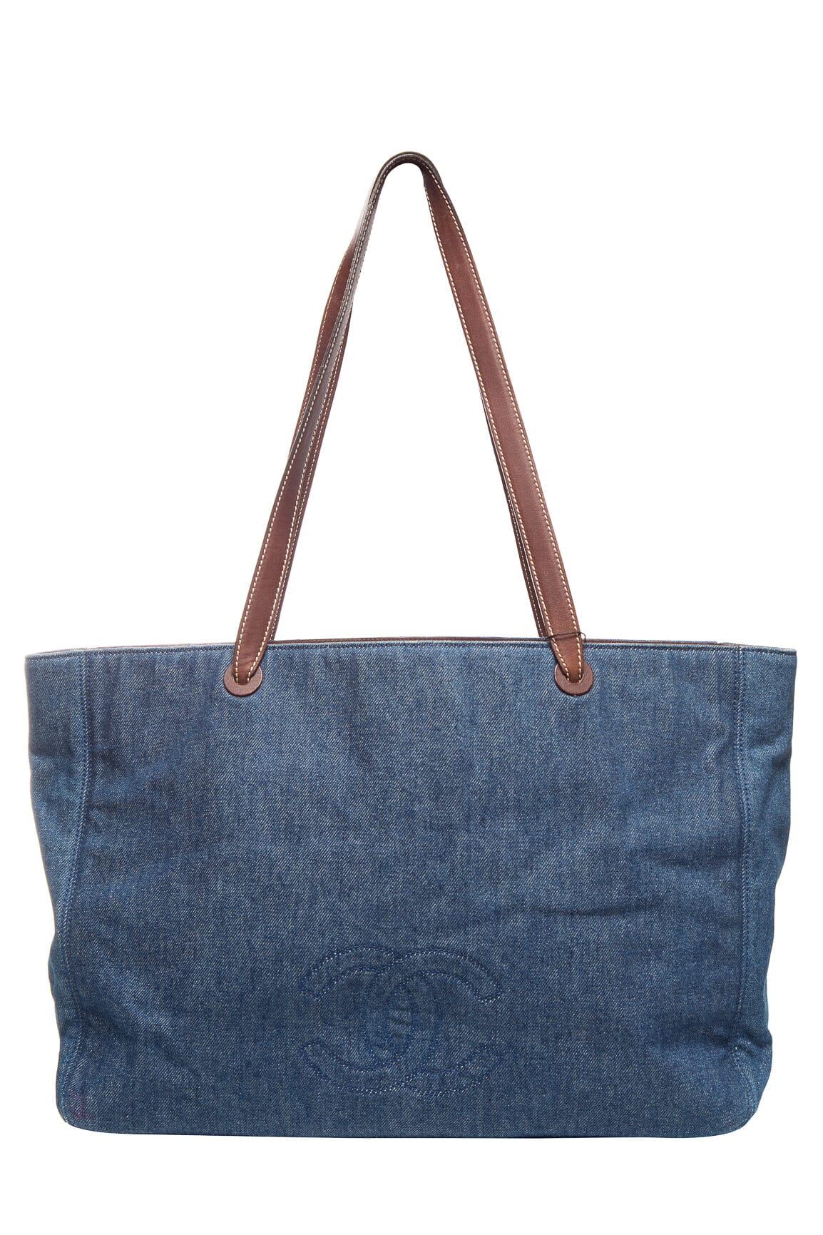 Chanel Denim Jumbo CC Logo Tote w/ dual leather shoulder straps. This item is in good condition; some rippling in denim front left side of bag.