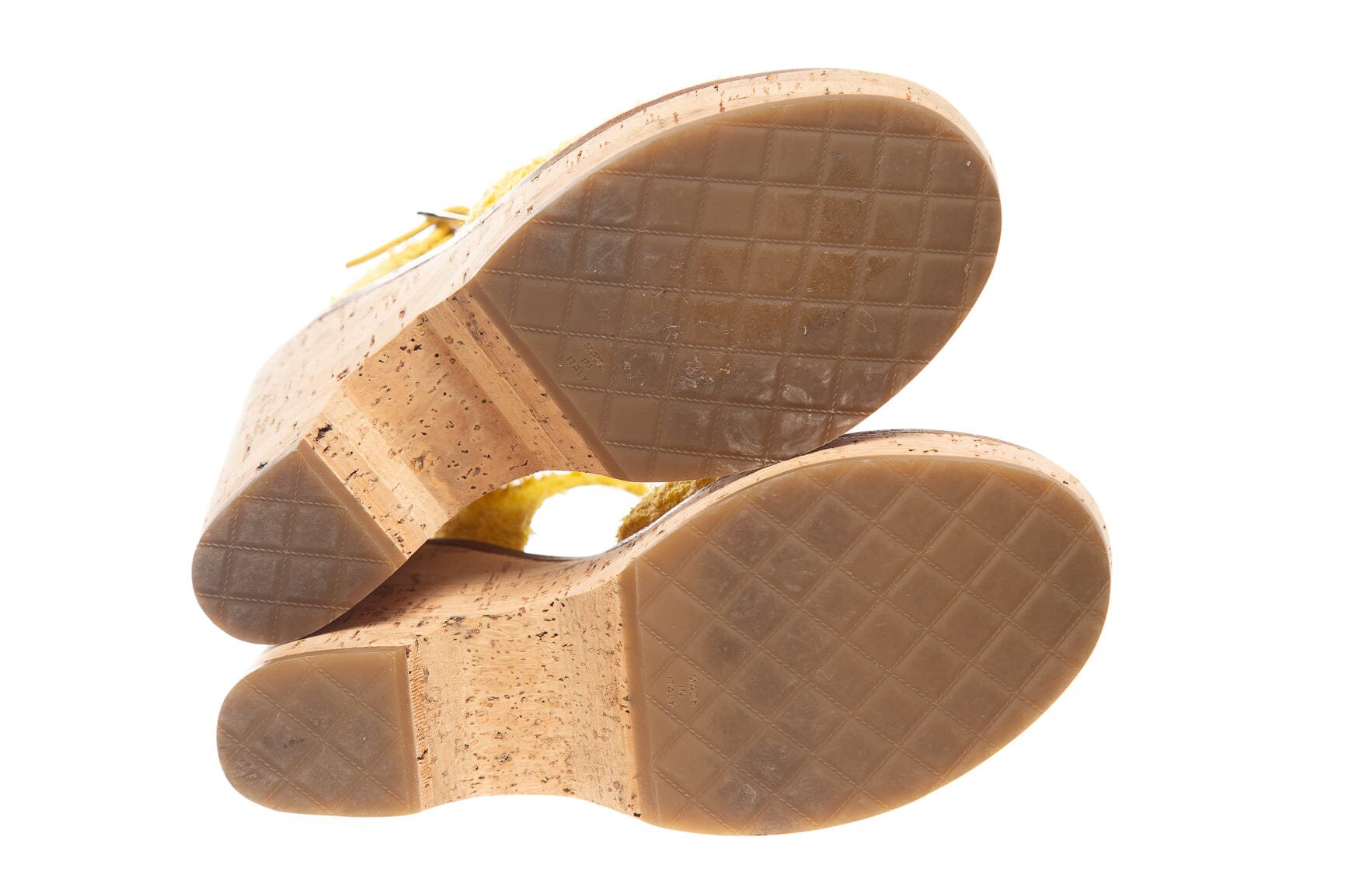 Chanel Yellow Tweed Wedge Ankle Strap Platforms w/Interlocking CC Emblem. This item is in very good condition.