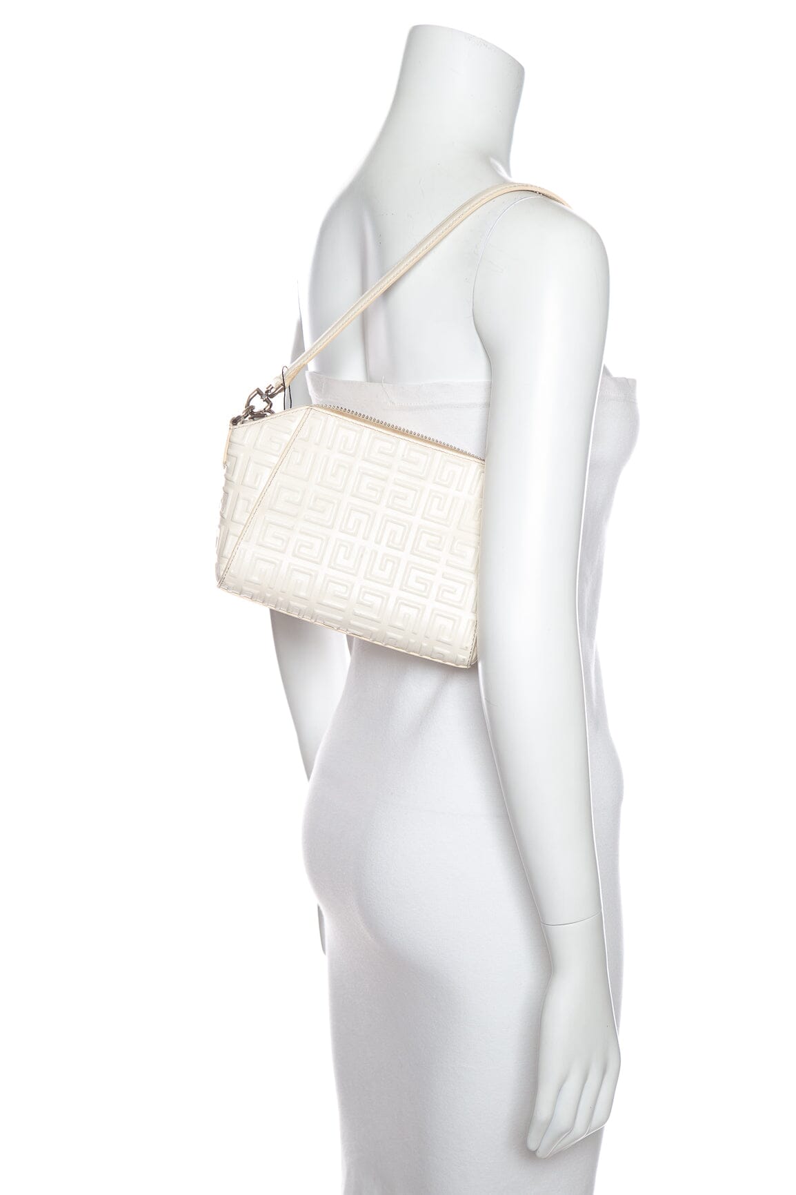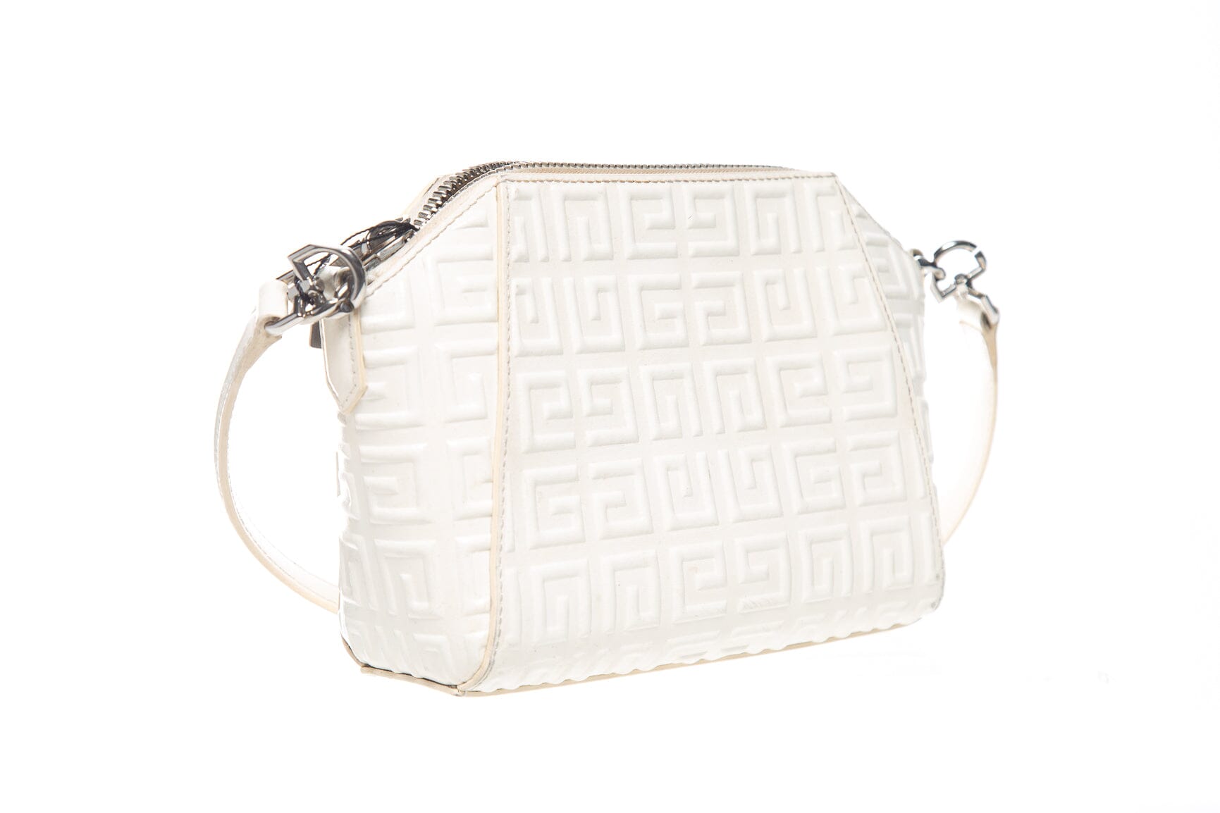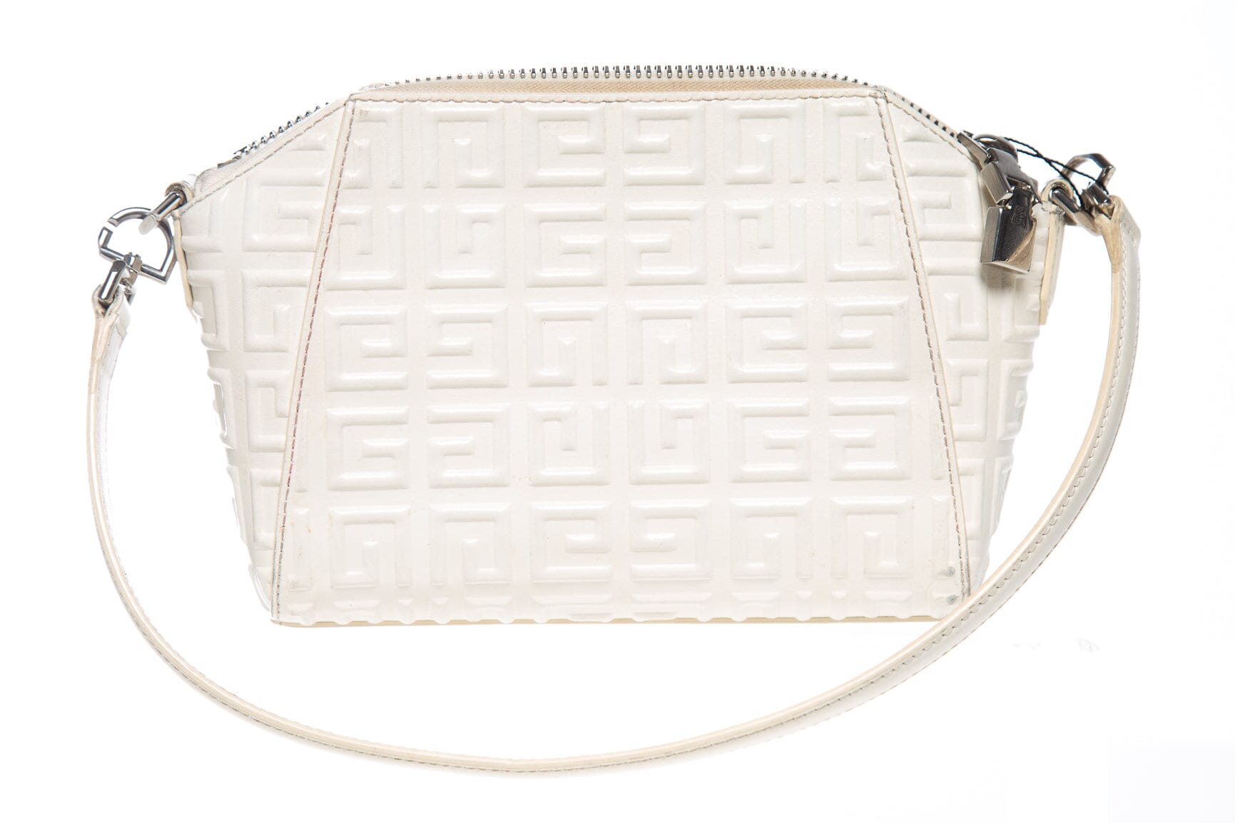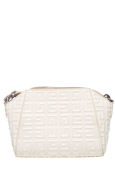 Givenchy White Antigona XS Debossed 4G Emblem Handbag. This item is in good condition; some slight wear on corners and staining on interior lining.