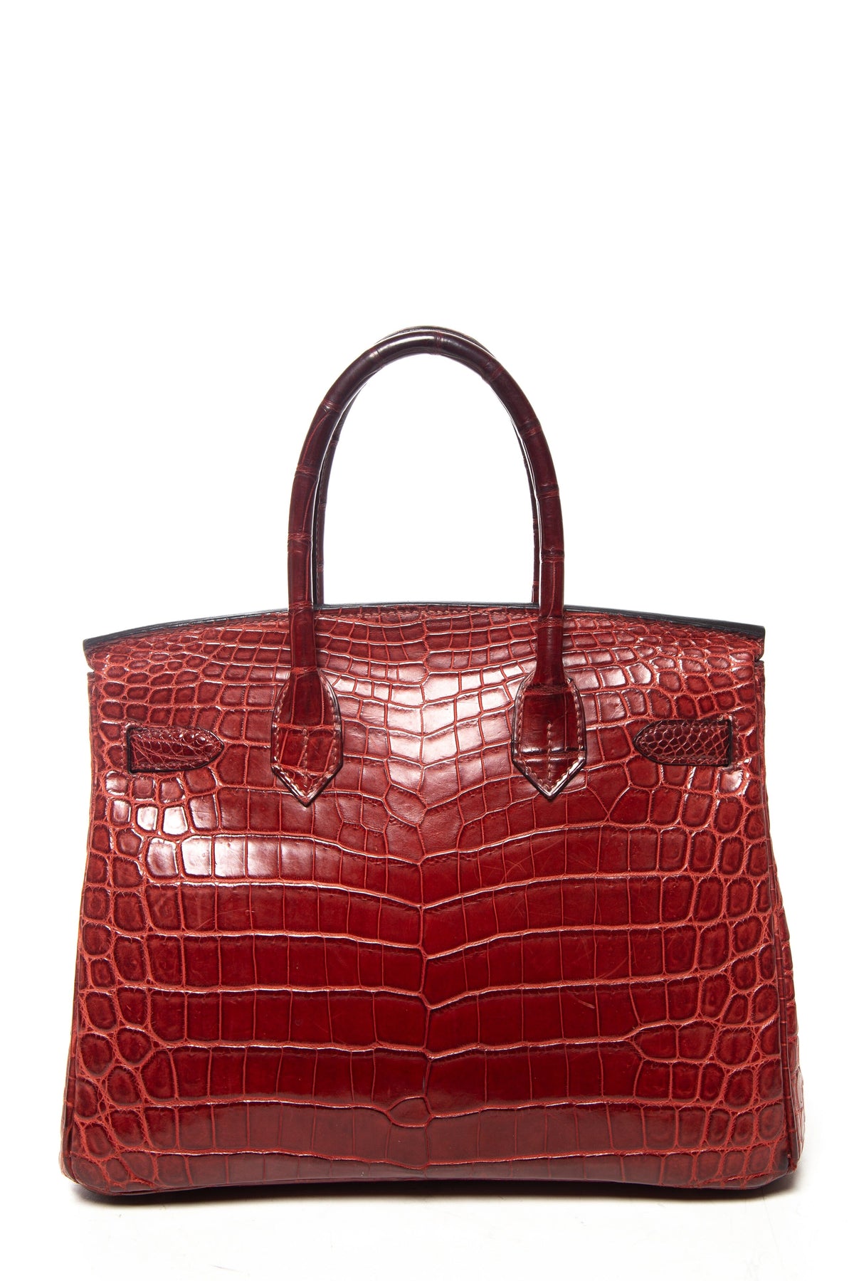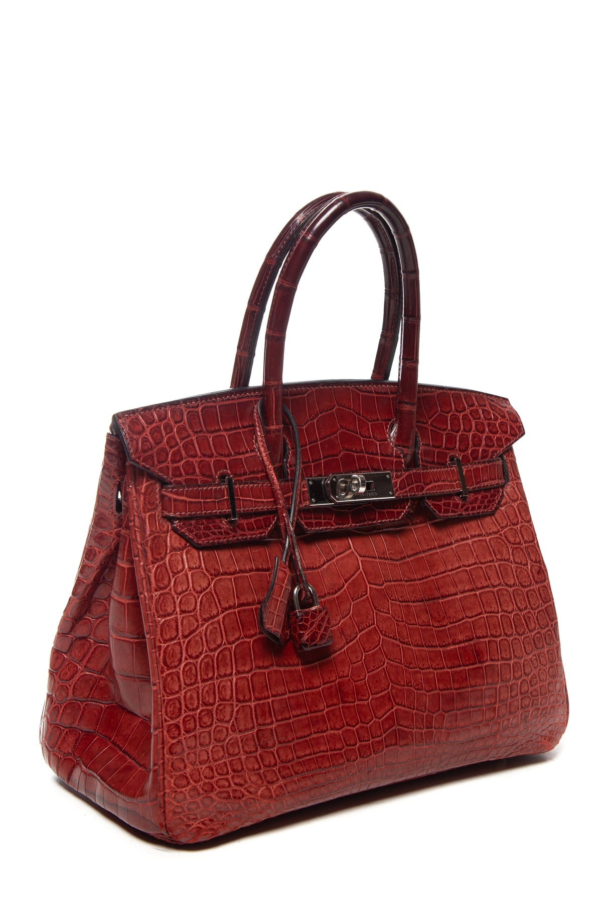 Hermès Birkin 30cm Rouge Matte Niloticus Crocodile Handbag. This item is in good condition; some staining and wear on interior fabric.
