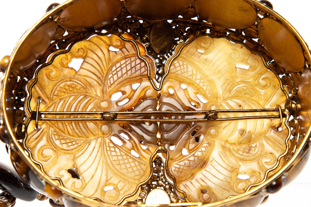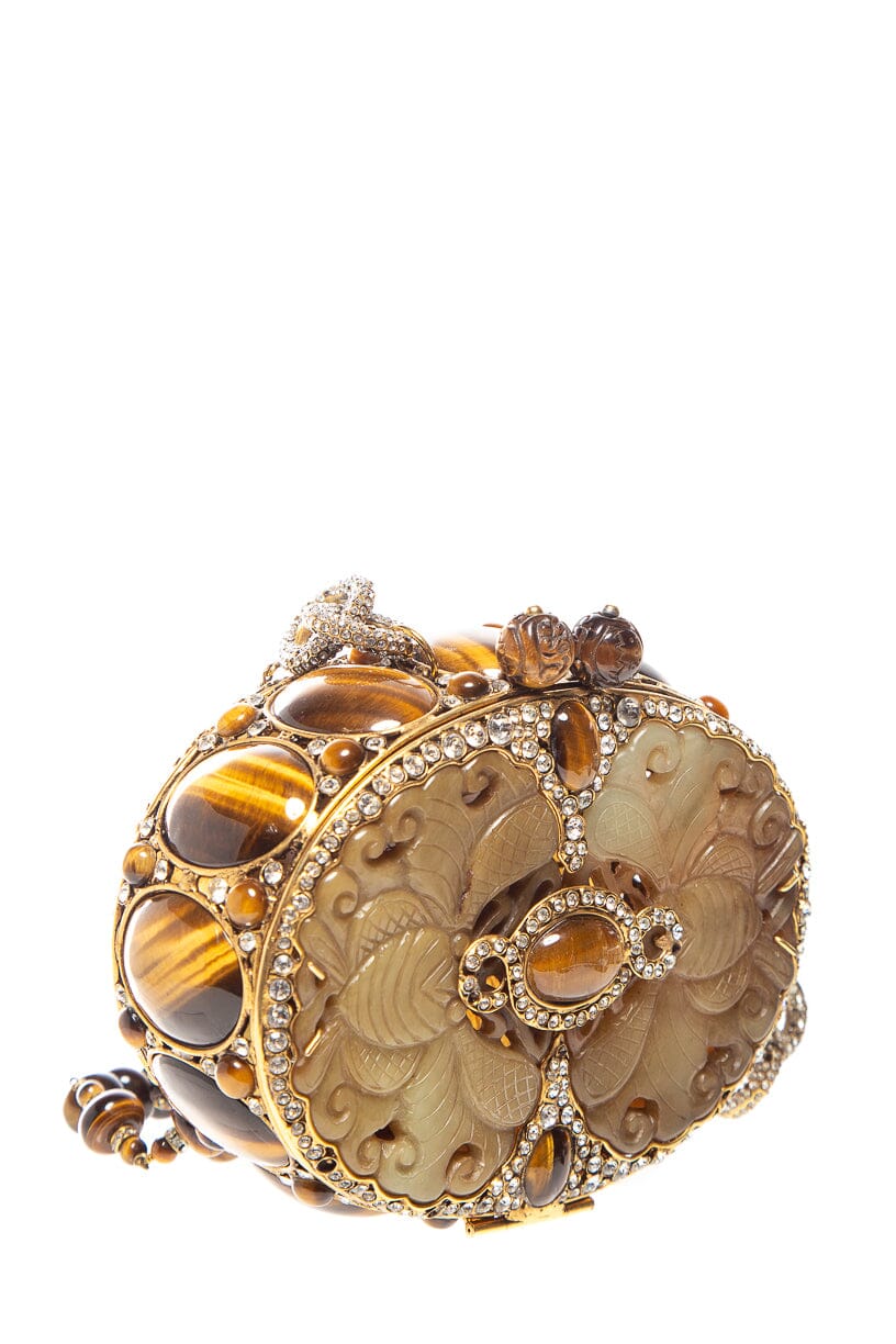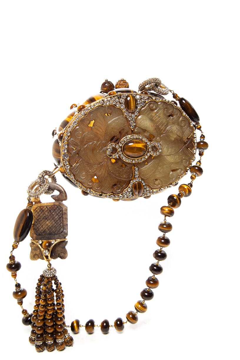 Iradj Moini Natural Tiger Eye and Onyx precious Stone Evening Bag. This item is in good condition; missing some crystal details.