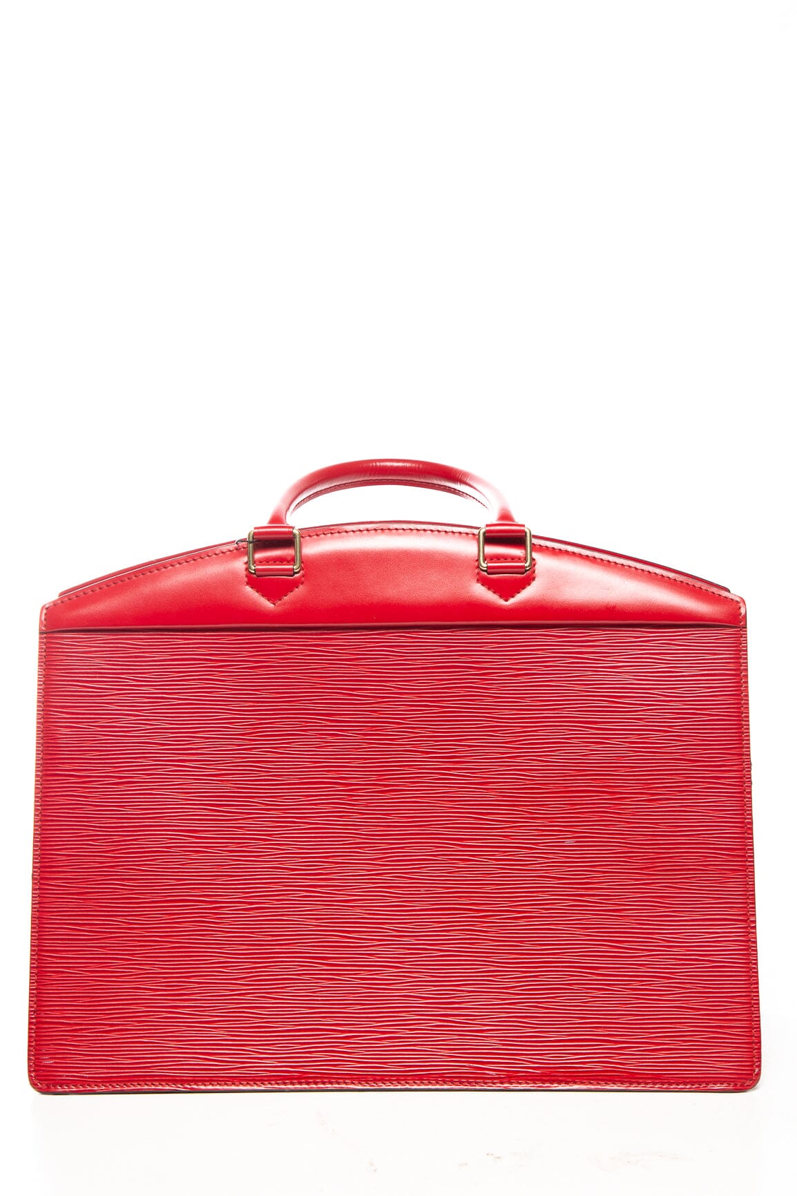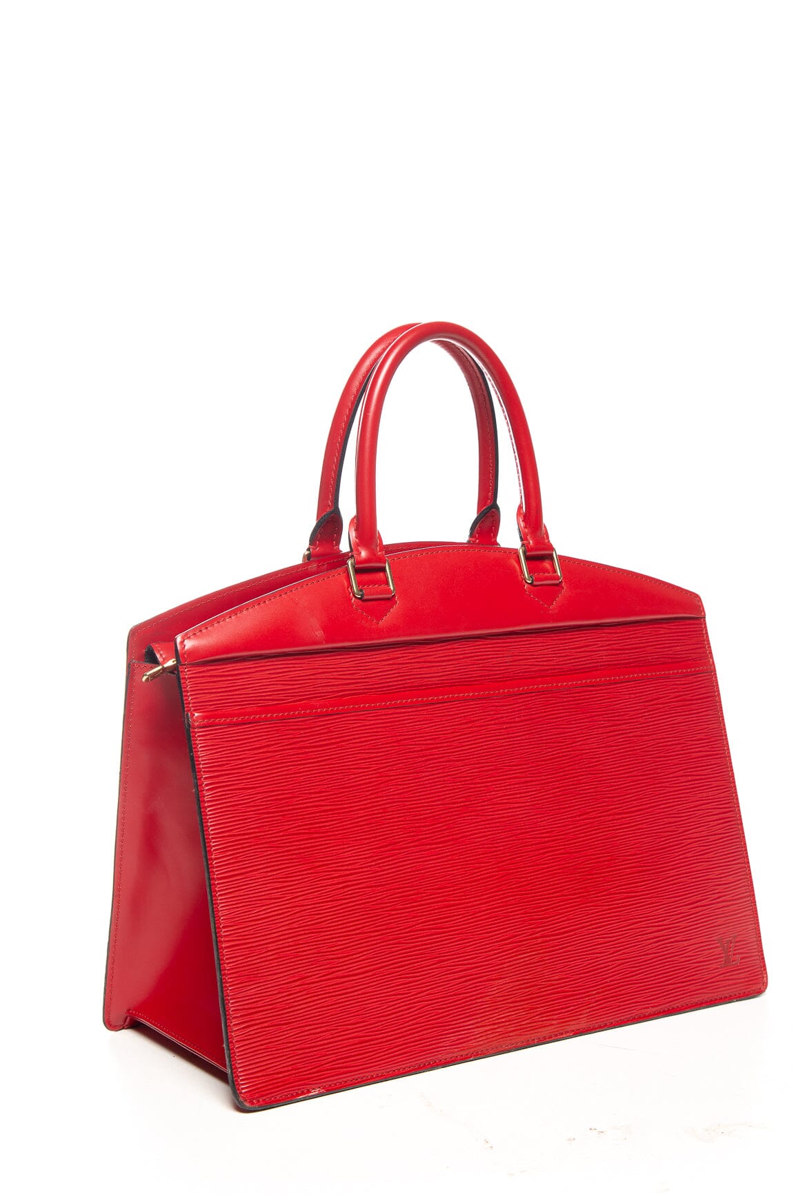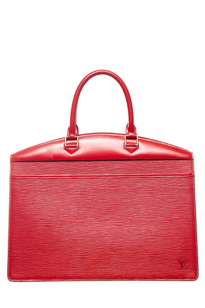 Louis Vuitton Red Epi Leather Riviera Top Handle Handbag. This item is in good condition; some discoloration/marks on exterior as well as some wear on lining (leather is flaking).