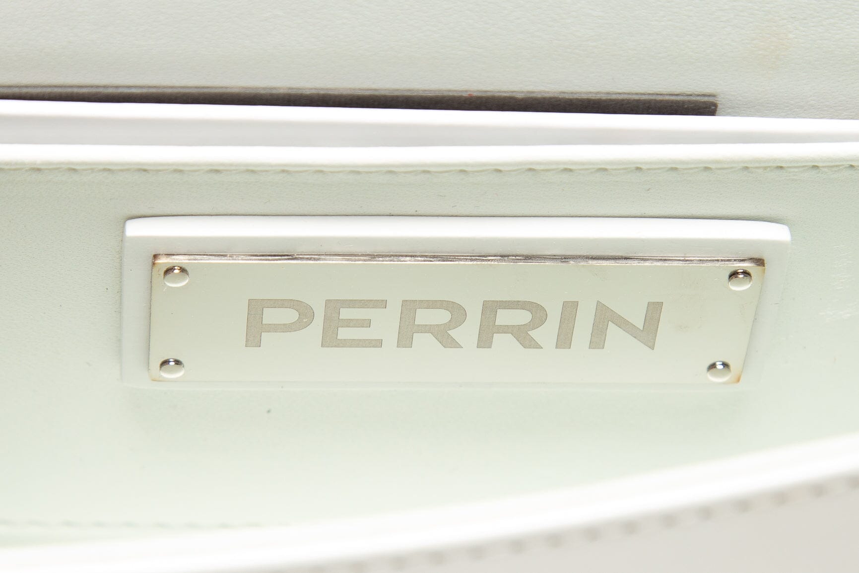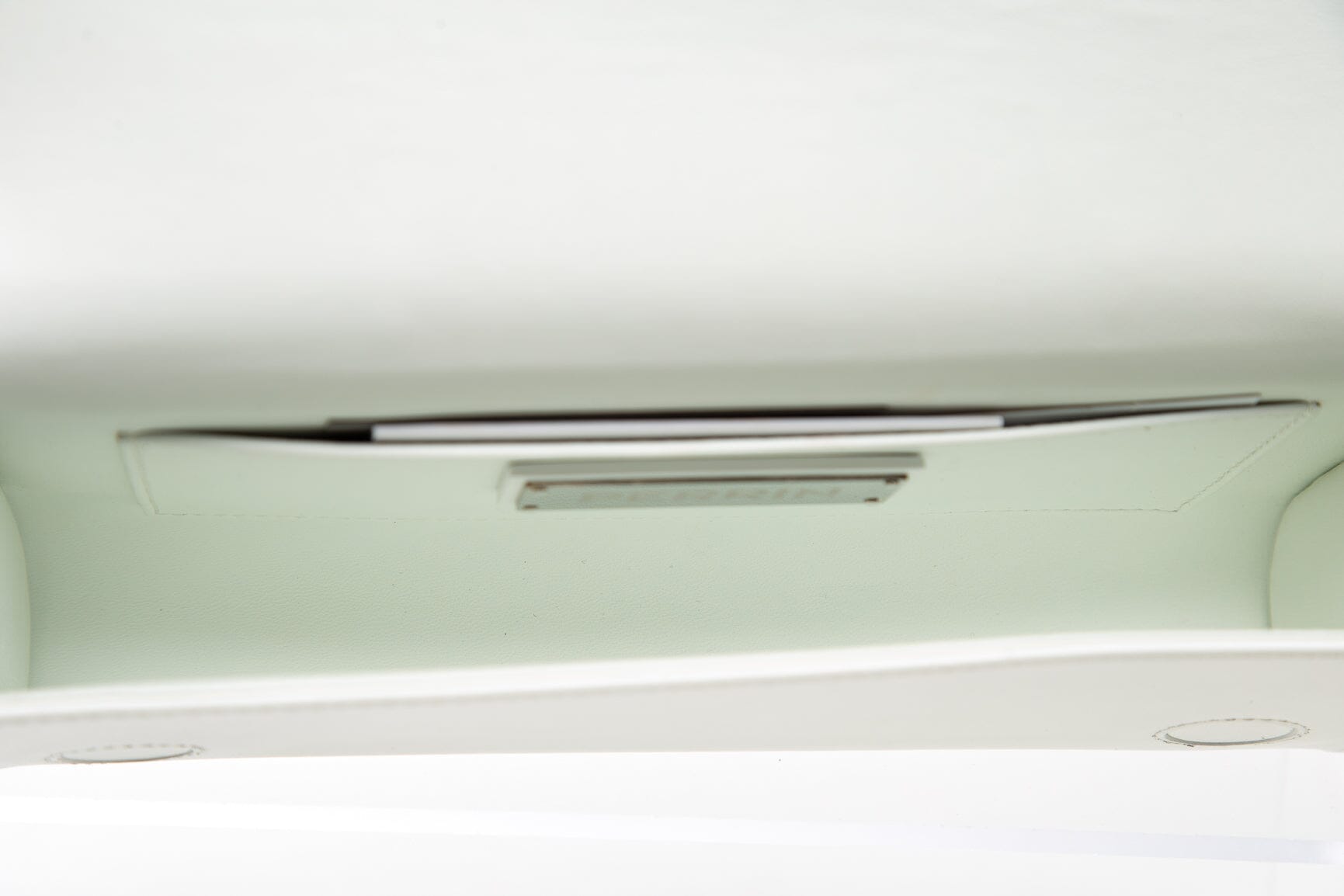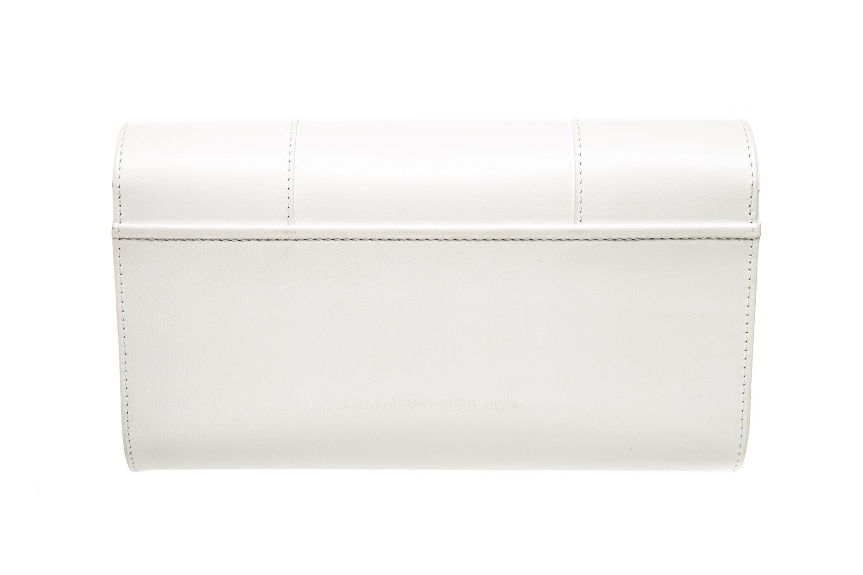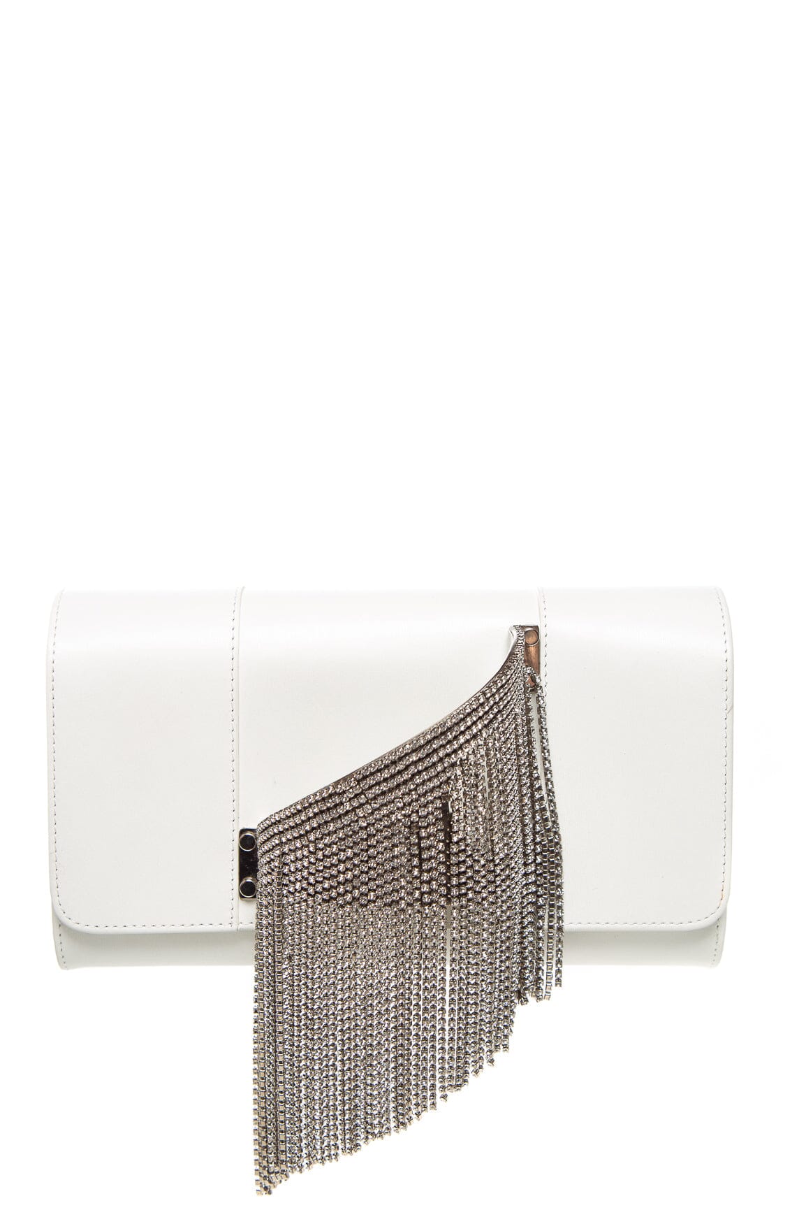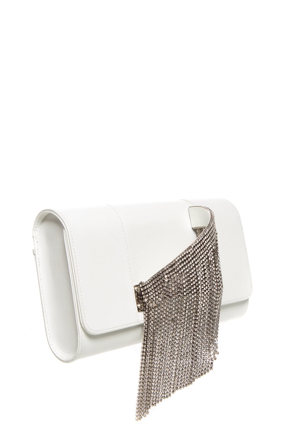 White leather clutch with fringe rhinestone handle. This item is in good condition; slight discoloration on back panel as well as one broken crystal strand.