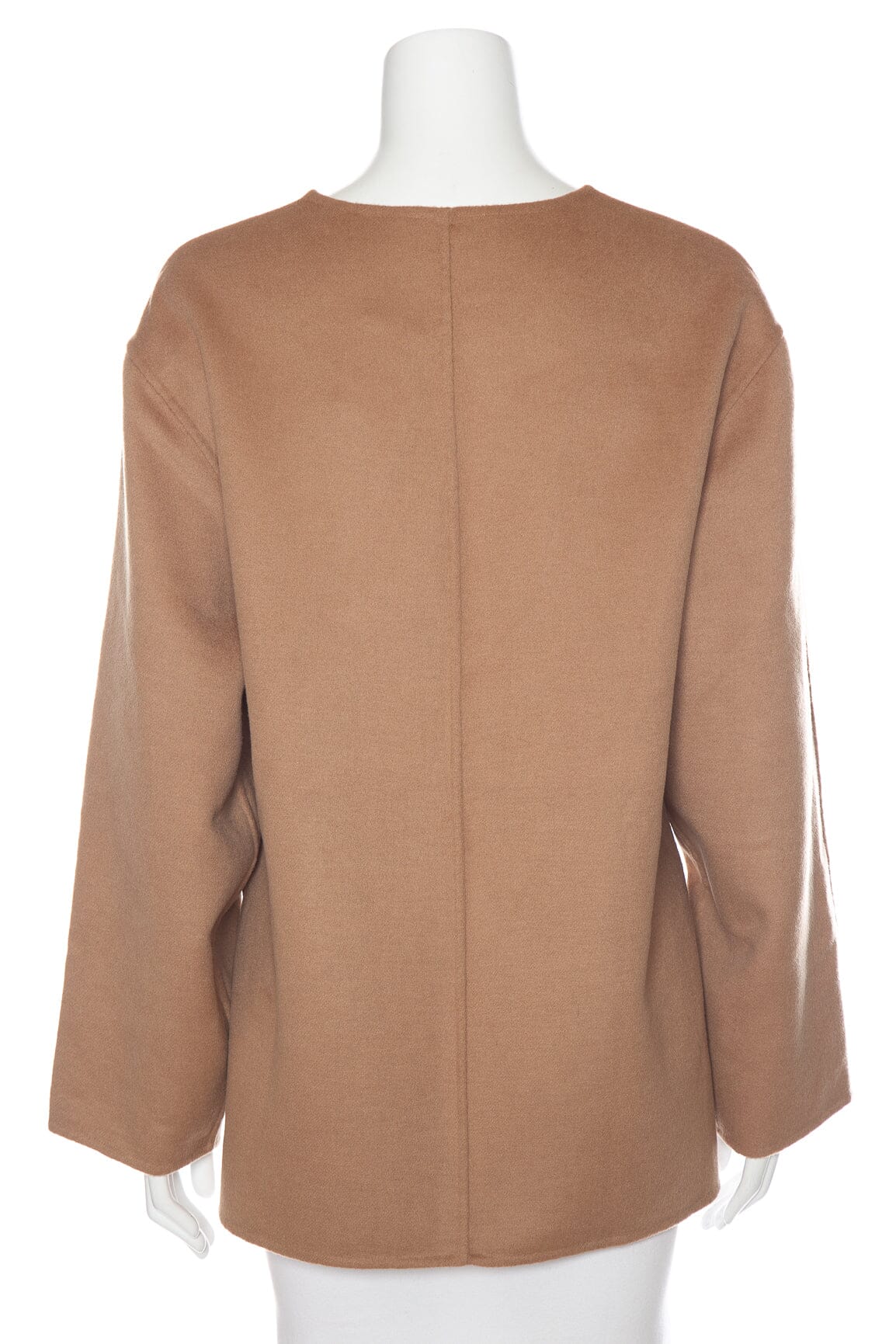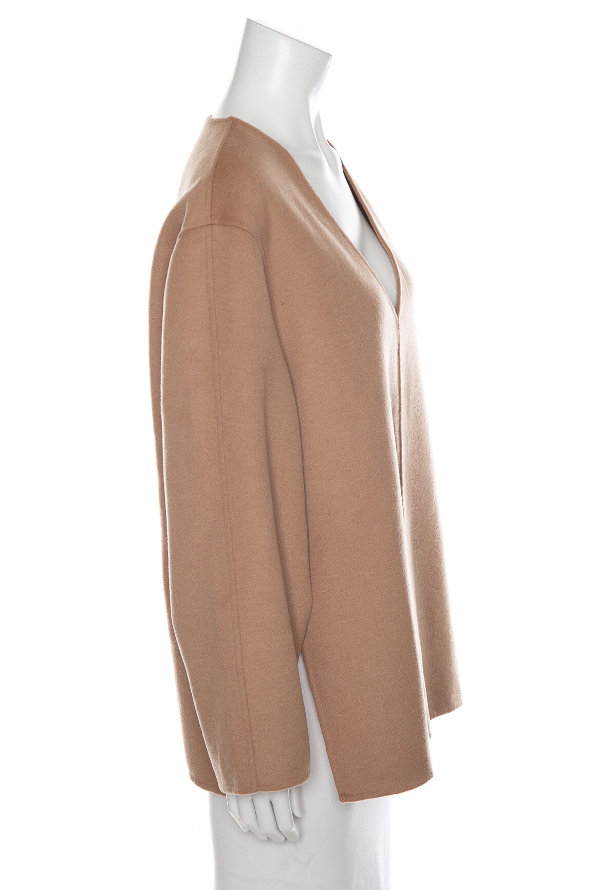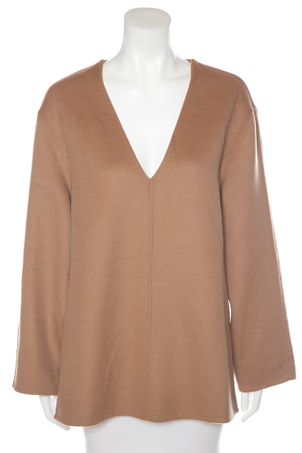Rohe Tan Wool Blend L/S Pullover V-Neck Top w/Side Slits. This item is in good condition; some discoloration on front panel.