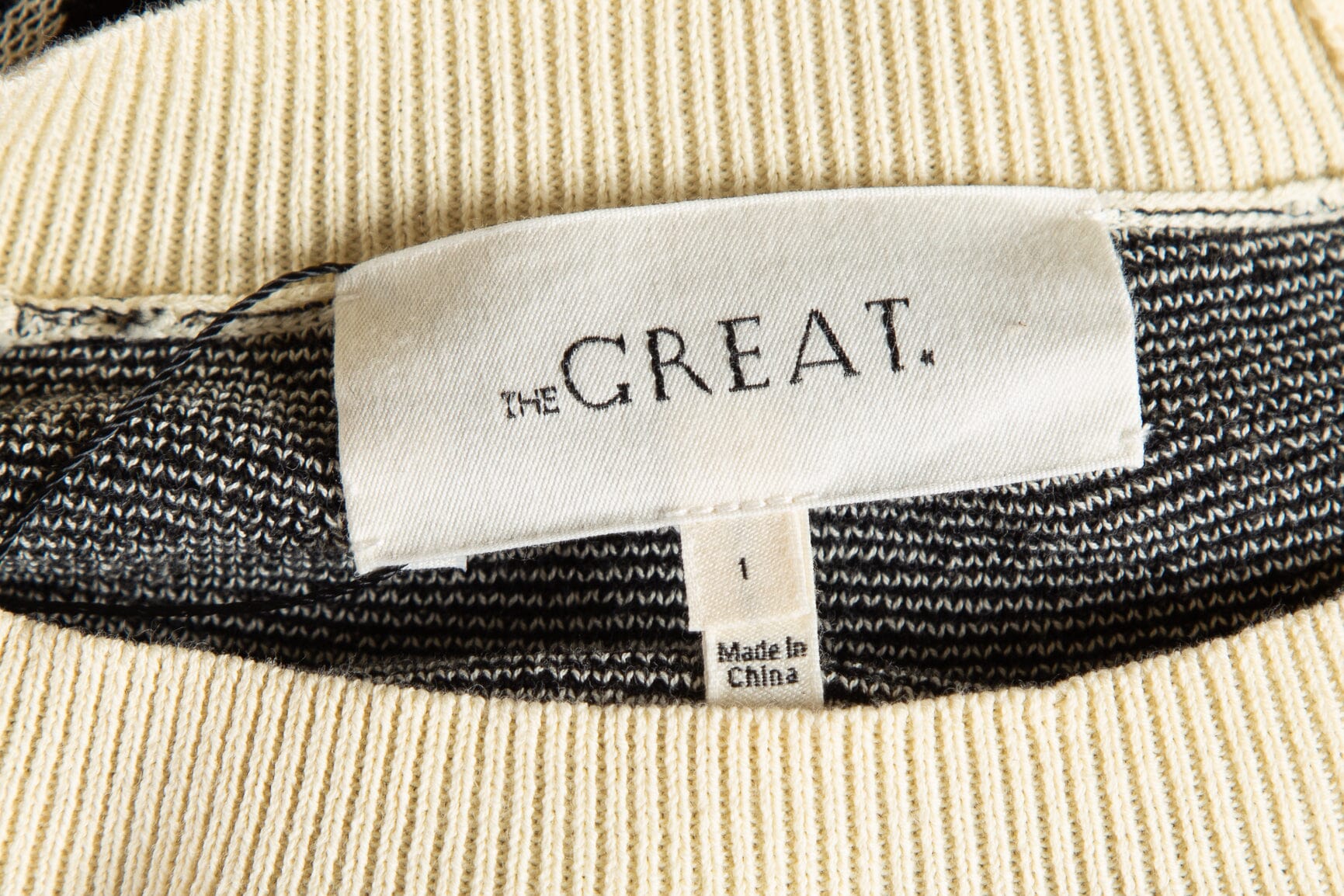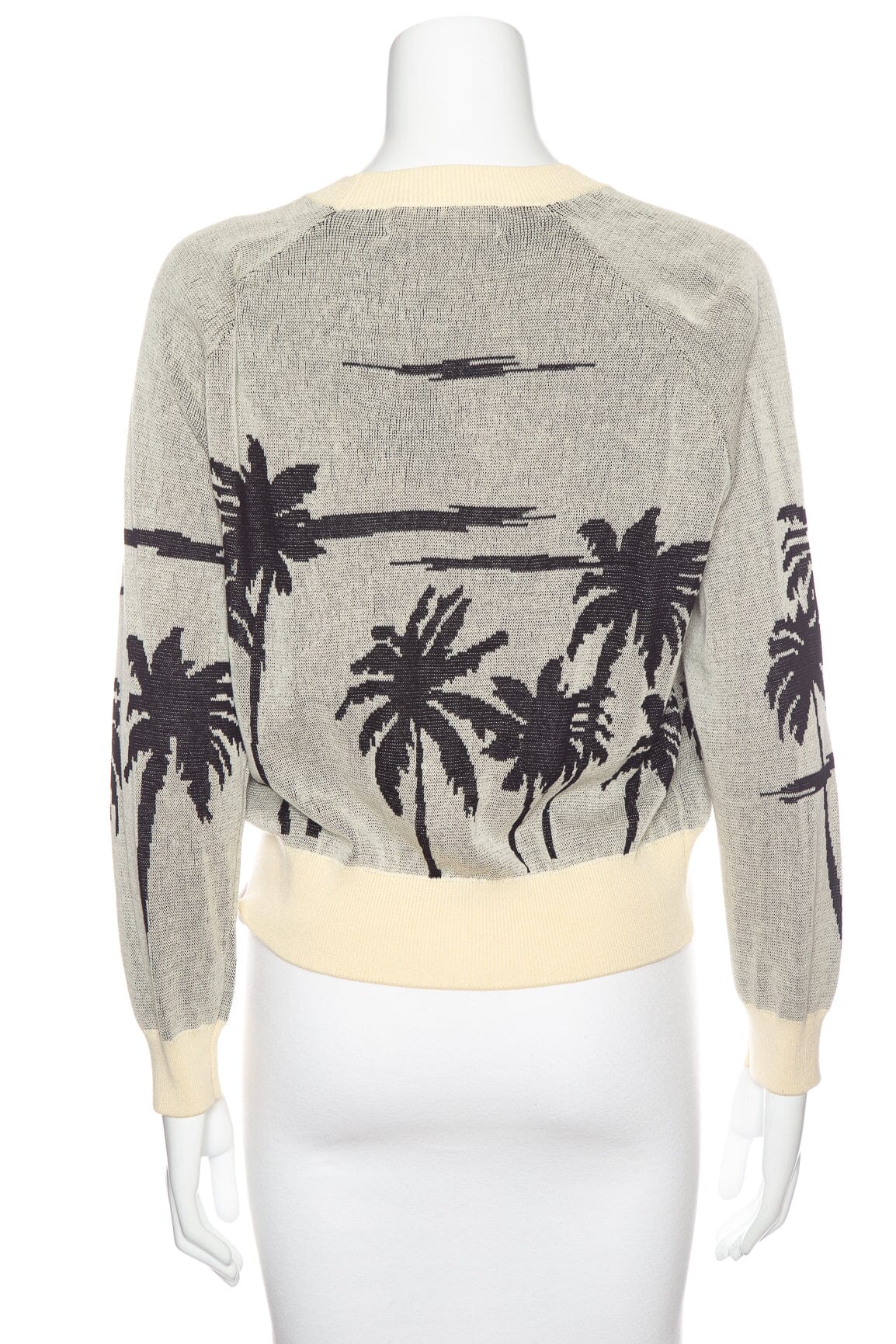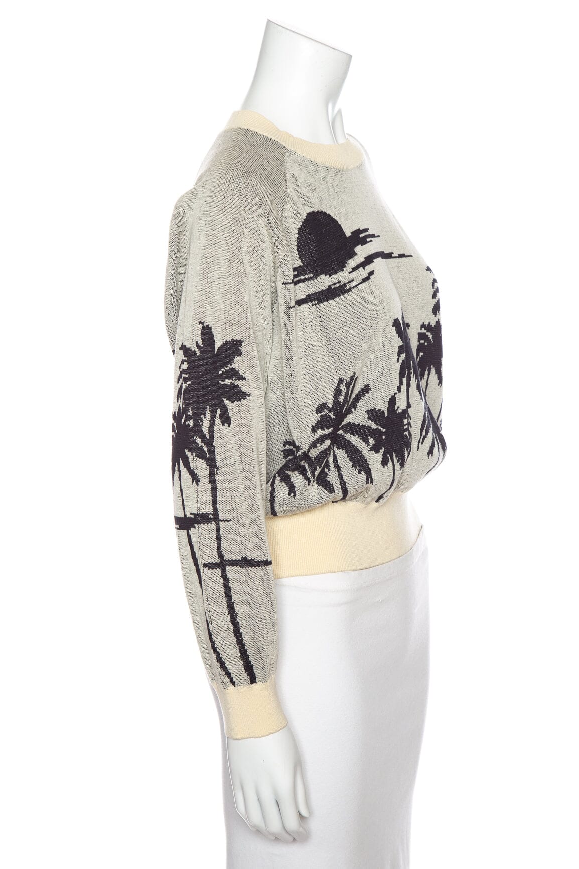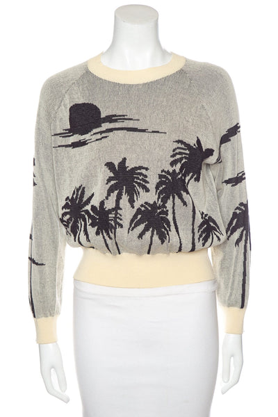 The Great Grey and Black Palm Tree Print Crewneck Sweater w/Cream Trim. This item is in very good condition.